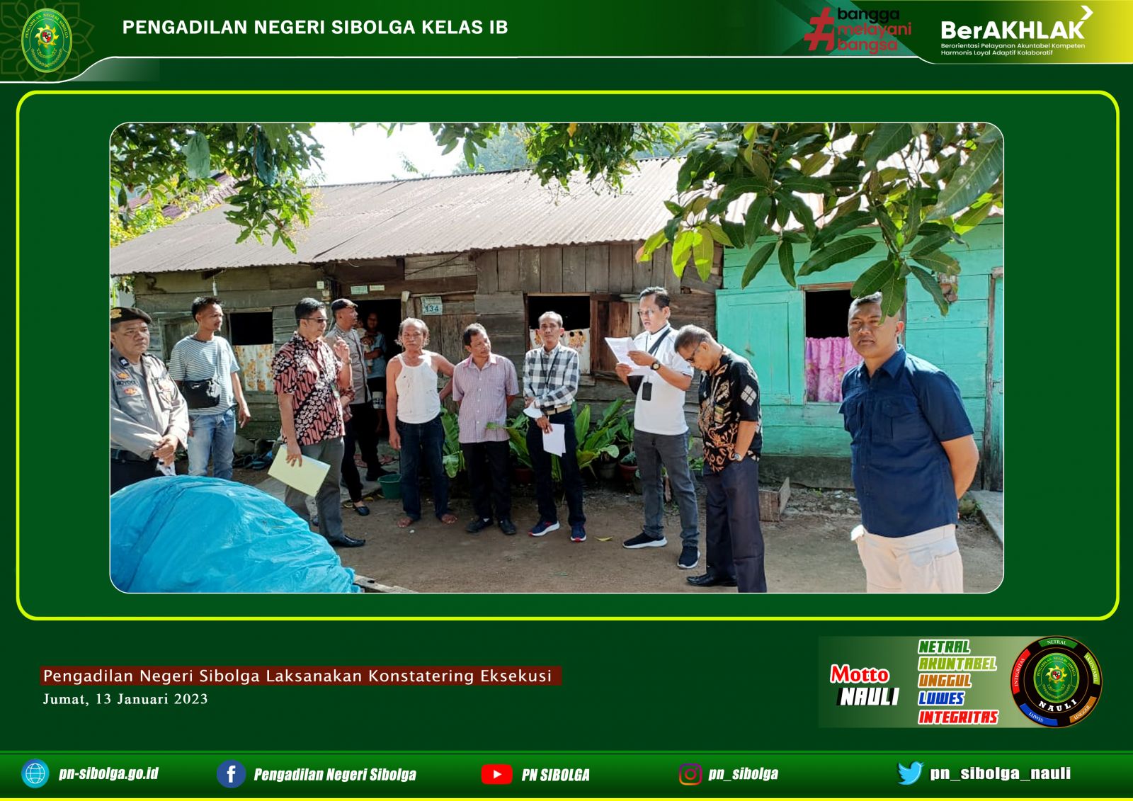 Jum’at, 13 Januari 2023 - Pengadilan Negeri Sibolga pada Jumat (13/1/2023) melaksanakan Konstatering Eksekusi atas perintah Ketua Pengadilan Negeri Sibolga Nomor W2-U9/240/KP.01.1/01/2023 tanggal 12 Januari 2023 dalam perkara gugatan Register Nomor Putusan Pengadilan Negeri Sibolga 12/Pdt.G/2019/PN Sbg. Objek perkara berupa harta tidak bergerak (barang tetap) diantaranya sebidang tanah yang terletak di Jl.Ketapang/Kemuning, Kelurahan Sibolga Ilir, Kecamatan Sibolga Utara, Kota Sibolga.