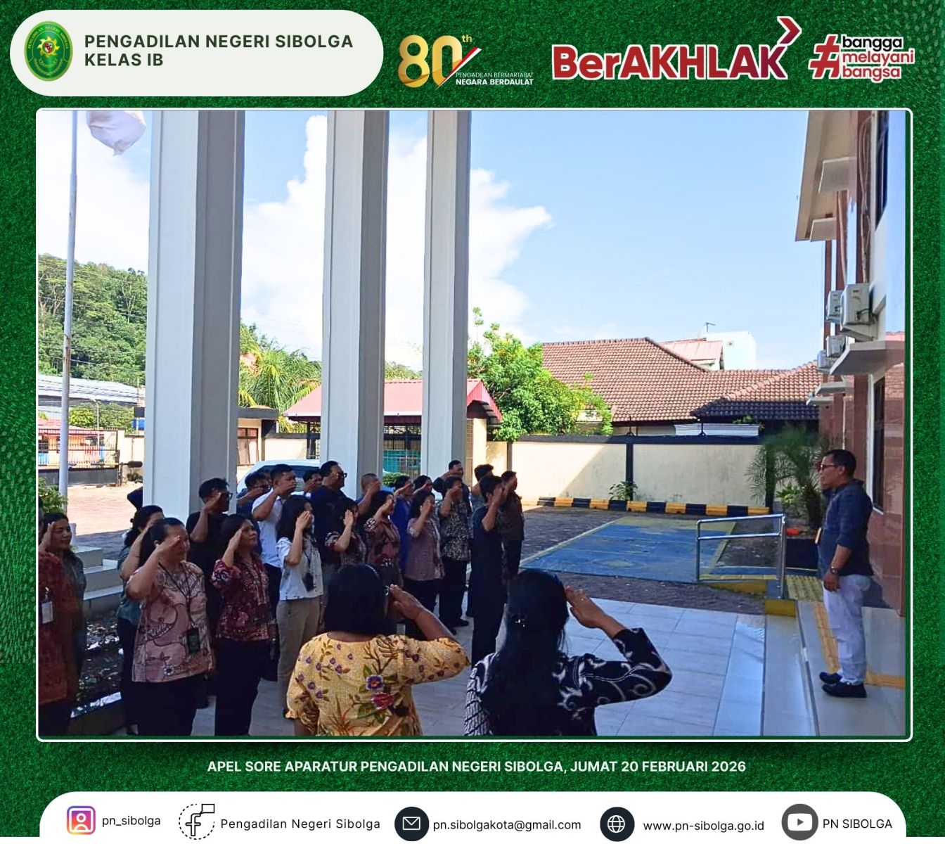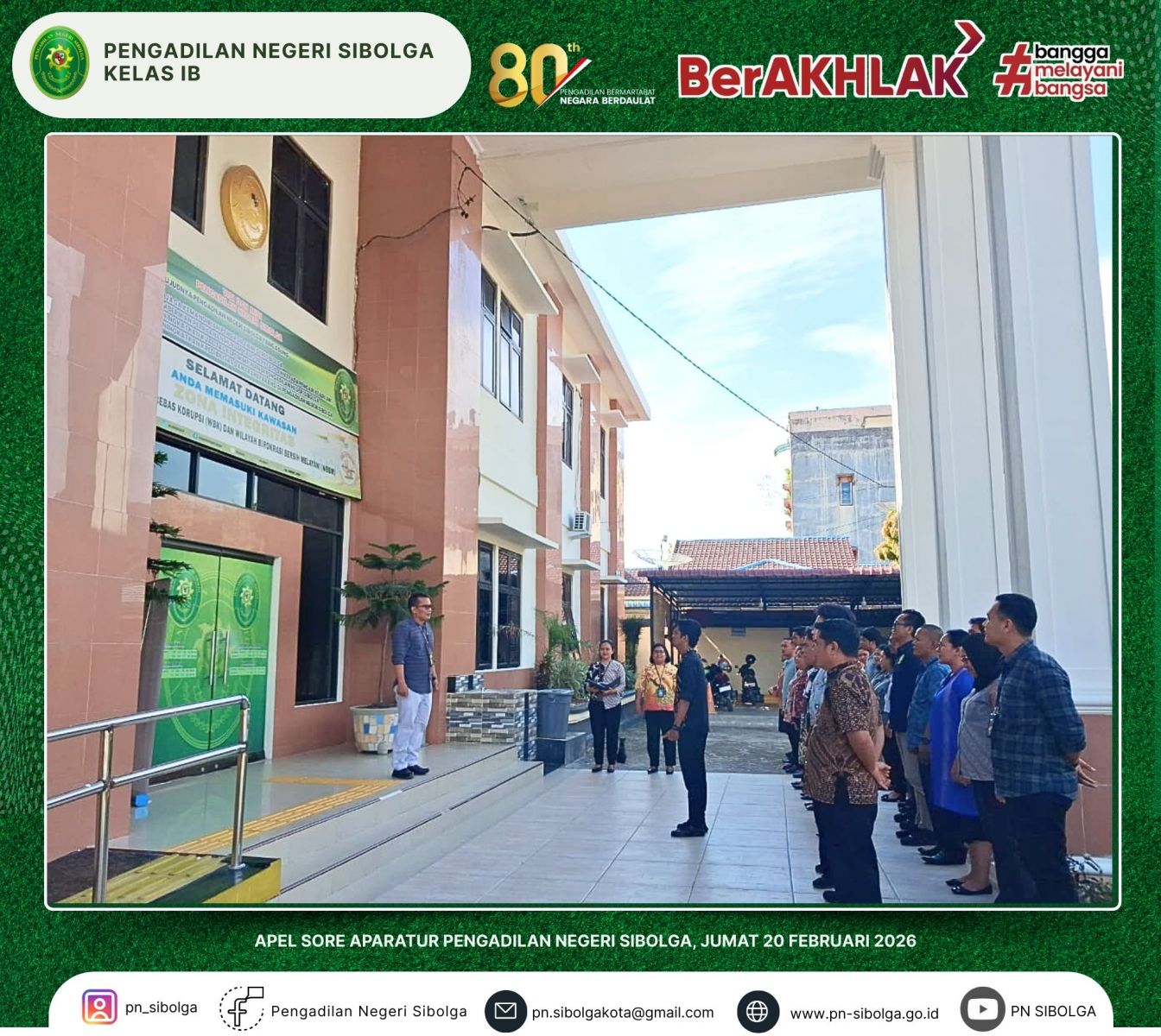 Pengadilan Negeri Sibolga melaksanakan apel sore pada Jumat, 20 Februari 2026, yang dipimpin oleh Sekretaris Pengadilan Negeri Sibolga, Bapak Bisnal Mariadi S, S.Kom, dan diikuti oleh seluruh aparatur Pengadilan Negeri Sibolga.
