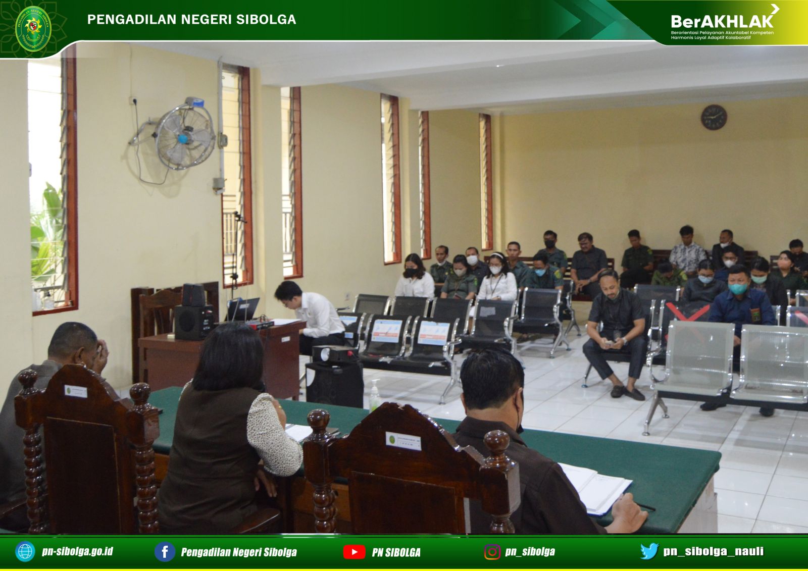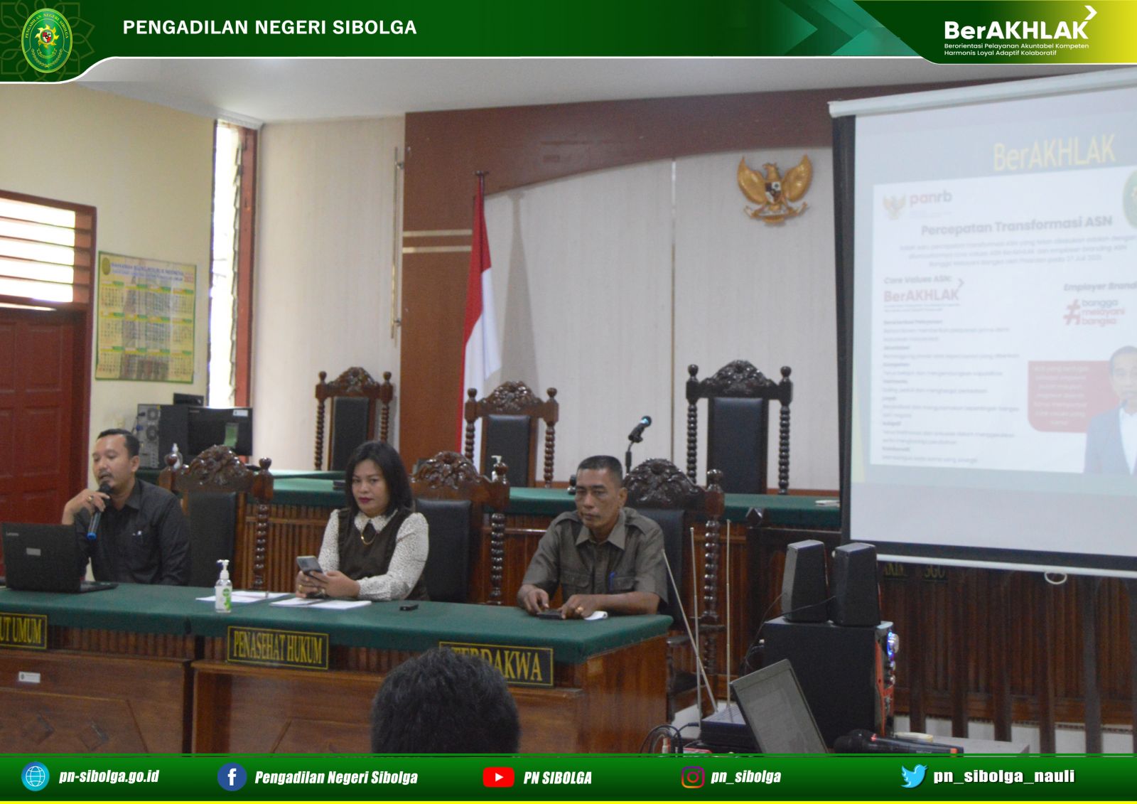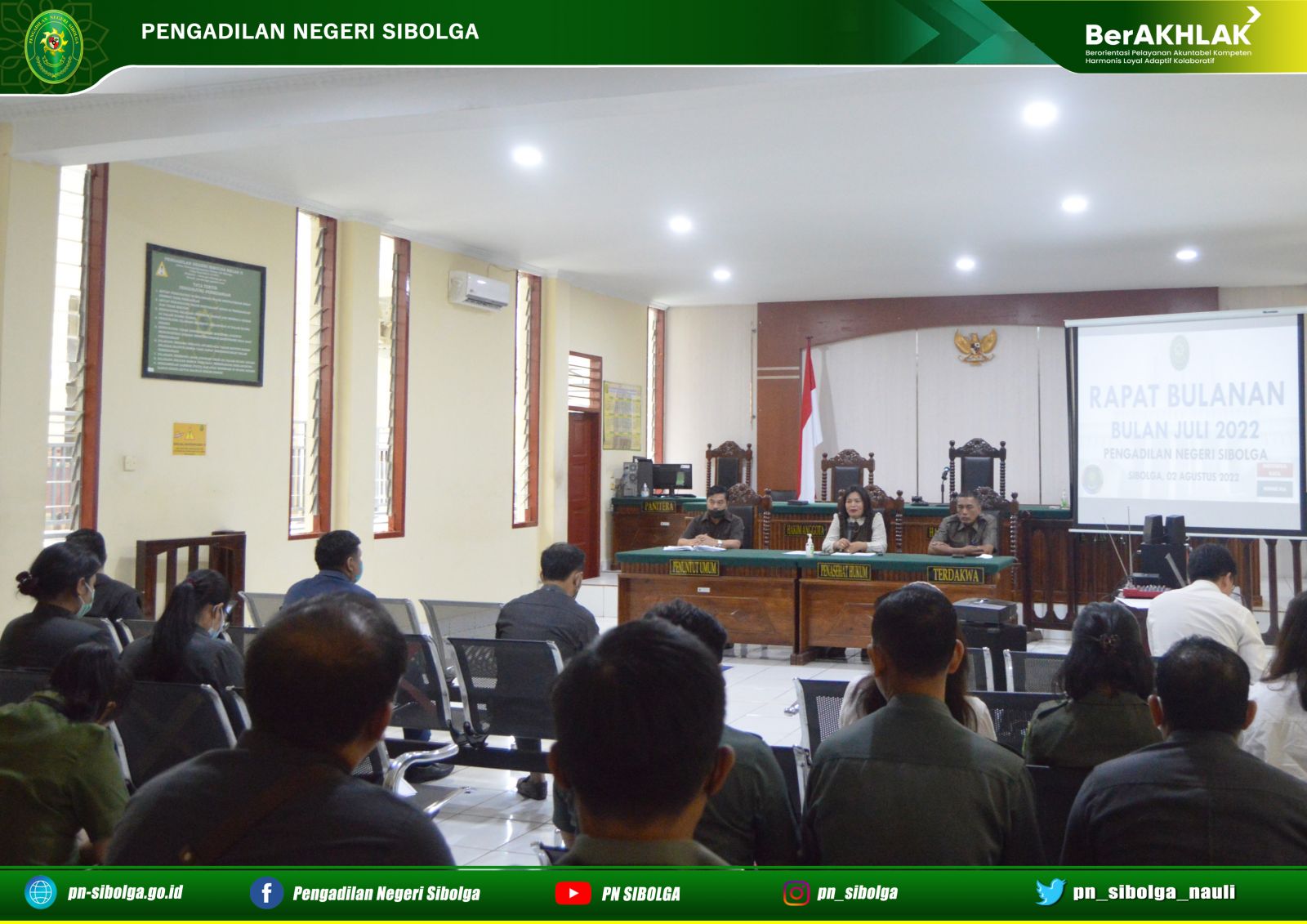 Bertempat di Ruang Sidang Cakra Pengadilan Negeri Sibolga telah dilaksanaan Rapat Bulanan, Monev ZI, Sosialisasi PERMA No. 7, 8, 9 serta Sosialisasi Core Values ASN Tahun 2022. Rapat dipimpin langsung oleh Ketua Pengadilan Negeri Sibolga Ibu Lenny Lasminar S, S.H., M.H, dihadiri oleh Hakim, Panitera, Sekretaris, Pejabat Struktural, Pejabat Fungsional, Staf serta PPNPN. Rapat kali mengevaluasi hasil kerja masing – masing bagian baik dari Kepaniteraan maupun Kesekretariatan dan mengenai permasalahan yang dialami oleh tiap bagian, serta membahas rencana kerja yang akan dilaksanakan selanjutnya.