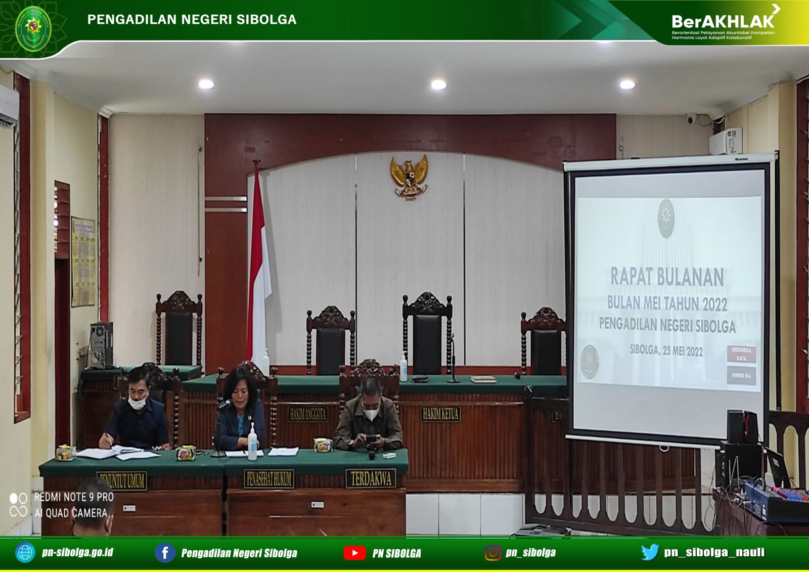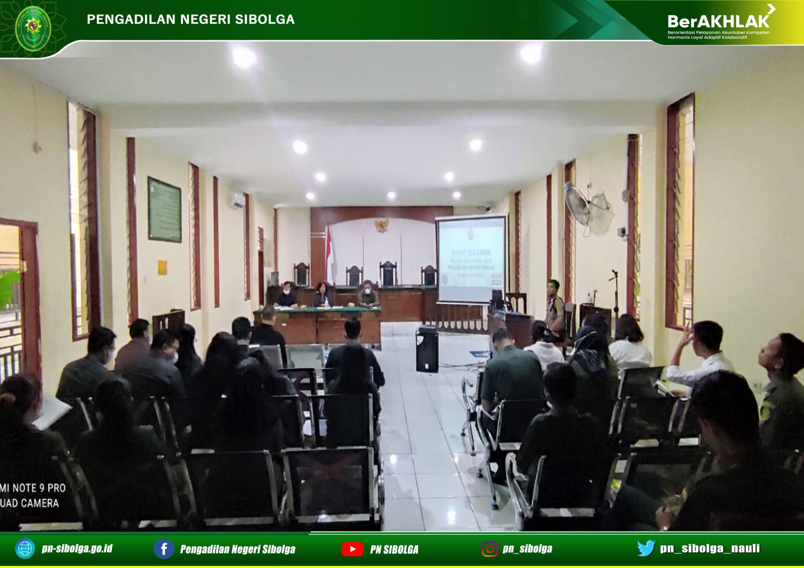 Bertempat di Ruang Sidang Cakra Pengadilan Negeri Sibolga telah dilaksanaan Rapat Bulanan Mei 2022. Rapat tersebut dipimpin langsung oleh Ketua Pengadilan Negeri Sibolga Ibu Lenny Lasminar S, S.H., M.H, dihadiri oleh Hakim, Panitera, Sekretaris, Pejabat Struktural, Pejabat Fungsional, Staf serta PPNPN.