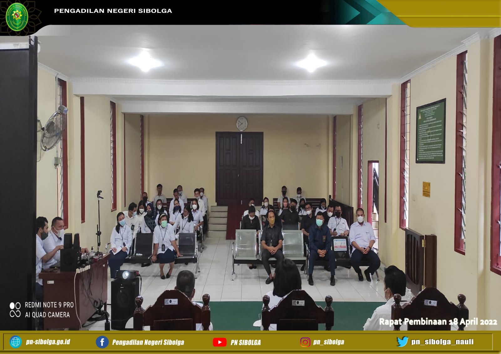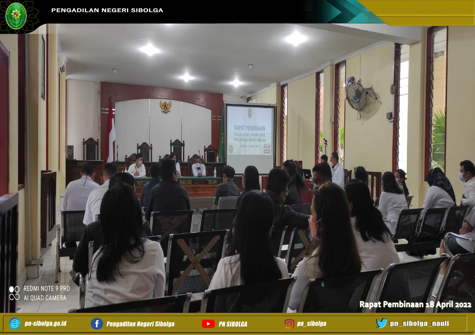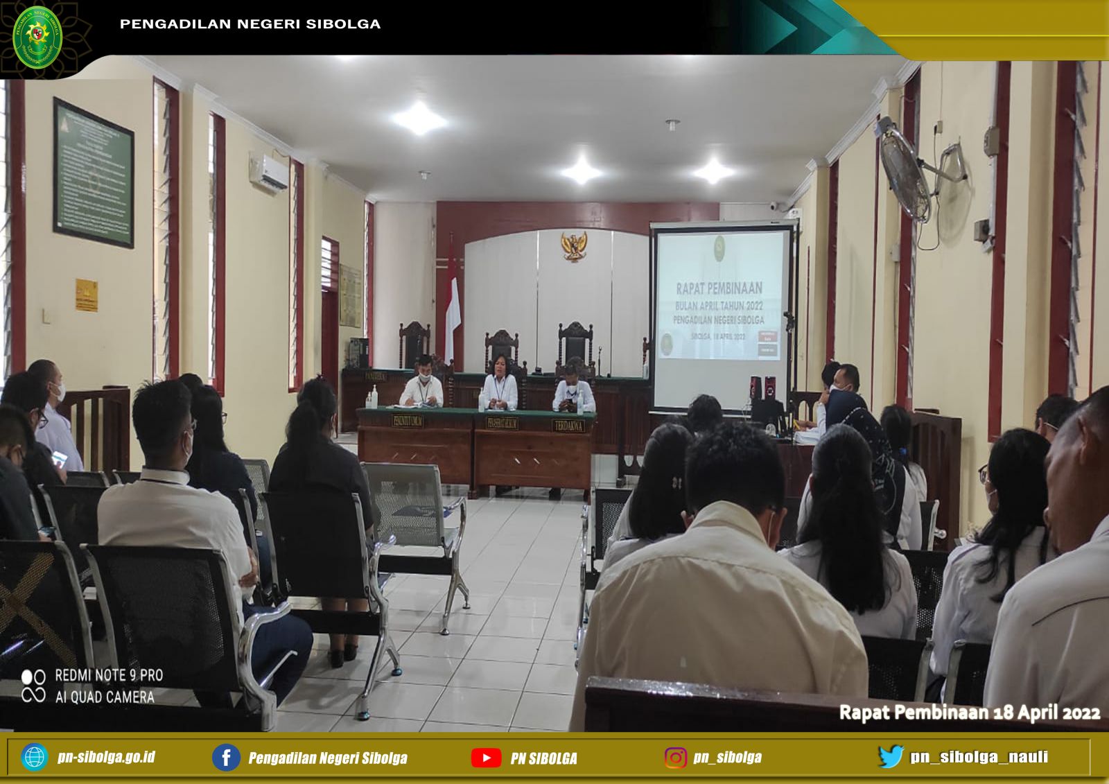 Sibolga, 18 April 2022 – bertempat di ruang sidang Cakra Pengadilan Negeri Sibolga pukul 08.30 WIB telah dilaksanakan rapat pembinaan. Ini adalah agenda pertama kalinya rapat dipimpin langsung oleh Ibu Lenny Lasminar S, S.H., M.H. sebagai Ketua Pengadilan Negeri Sibolga yang baru sejak Pelantikan dan Serah Terima Jabatan yang diselenggarakan pada Rabu, 13 April 2022 lalu di Pengadilan Tinggi Medan, menggantikan Ibu Gabe Dorris Mora Boru Saragih, S.H, MH yang dipromosikan sebagai Wakil Ketua pada Pengadilan Negeri Gunung Sitoli yang dihadiri seluruh hakim, pejabat struktural dan fungsional, beserta seluruh pegawai, dan PPNPN .